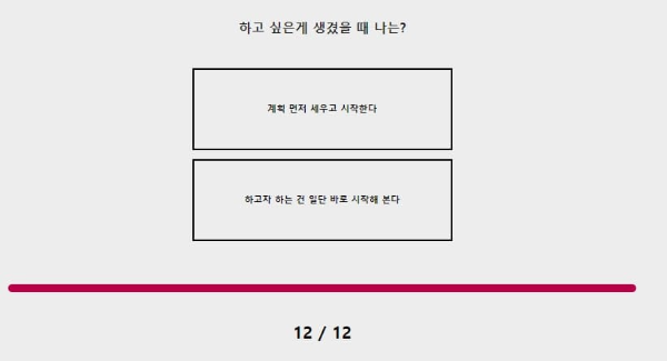 하고 싶은 게 생겼을 때 나는? 계획 먼저 세우고 시작할 거예요. 어떤 일이든 계획을 세우고 차근차근 순서에 맞게 진행해야 적성에 풀리는 성격이에요. 그것이 곧 효율이라고 생각하기 때문이에요
