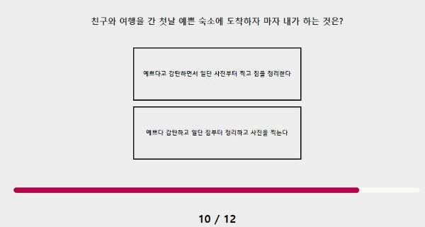 친구와 여행을 간 첫날 예쁜 숙소에 도착하자마자 내가 한 것은? 예쁘다고 감탄하면서 일단 사진 찍고 짐을 정리할 것 같아요. 인생에 남는 건 사진 밖에 없다고 생각해서 사진을 많이 찍어놔야 할 것 같아요