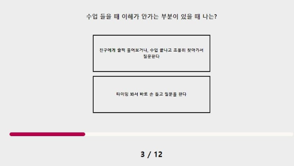 수업 들을 때 이해가 안 가는 부분이 있을 때 나는? 친구에게 슬쩍 물어봐야지 모르고 지나가면 그 이후에 수업도 이해가 안 되어서 물어볼 것 같아요. 물어볼 상황이 안된다면 수업이 끝나고 바로 질문을 할 것 같아요