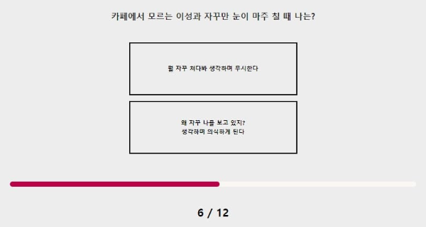 카페에서 모르는 이성과 자꾸만 눈이 마주칠 때 나는? 뭘 자꾸 쳐다봐 생각하여 무시할 것 같아요. 나 역시 다른 사람을 잘 쳐다보지 않기 때문에 그런 생각을 하는 거 같아요
