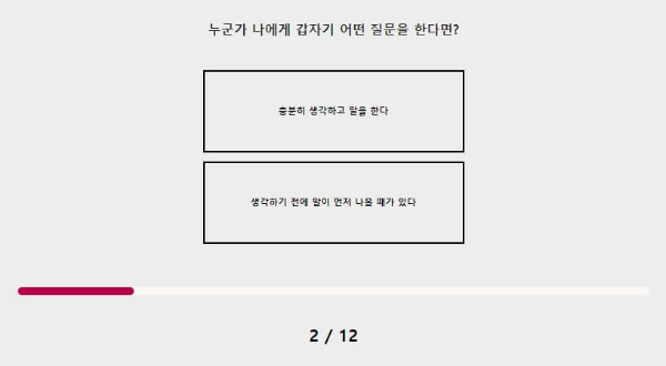 누군가 나에게 갑자기 어떤 질문을 한다면? 충분히 생각하고 대답을 해주는 성격이에요 상대방도 고민하고 질문을 했을 거라고 생각해서 저도 고민을 많이 하고 대답해 줄 것 같아요
