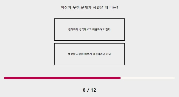 예상치 못한 문제가 생겼을 때 나는? 침착하게 생각해 보고 해결하려고 한다. 무슨 문제든 해결 방법은 언제나 존재하고 그것을 얼마나 빠르고 현명하게 해결하냐의 차이라고 생각해요.