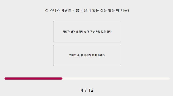 길 가다가 사람들이 많이 몰려 있는 것을 봤을 때 나는? 가 봤자 별거 있겠나 싶어 그냥 가던 길을 갈 것 같아요 다른 사람의 행동에 큰 의미를 부여하고 살지 않기 때문이에요. 개인주의라고 생각할 수 있겠지만 다른 사람도 날 신경 쓰지 않았으면 좋겠는 것 과 같은 이치라고 생각해요