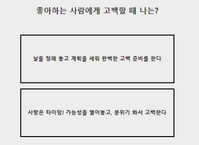 좋아하는 사람에게 고백할 때 나는? 남을 정해 놓고 계획을 세워 완벽한 고백을 하는 스타일이에요. 상대방이 눈치채지 못하게 완벽하게 준비하고 성공한다면 너무 행복하고 기분 좋을 거 같아요