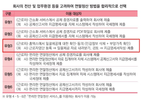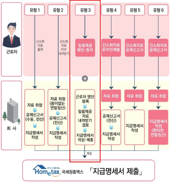 23년 기준으로 연말정산 일괄 제공 서비스가 간편화 되었습니다. 유형 3에 해당하는 사항으로 근로자가 홈텍스에서 일괄제공에 대하여 동의를 하게 된다면 회사에서는 근로자 명단 등록 후 일괄제공 자료 내려받기를 진행할 수 있습니다. 그로인해 작년대비 근로자가 직접 간소화 시스템을 이용하지 않아도 되는 간편함이 생겼습니다.